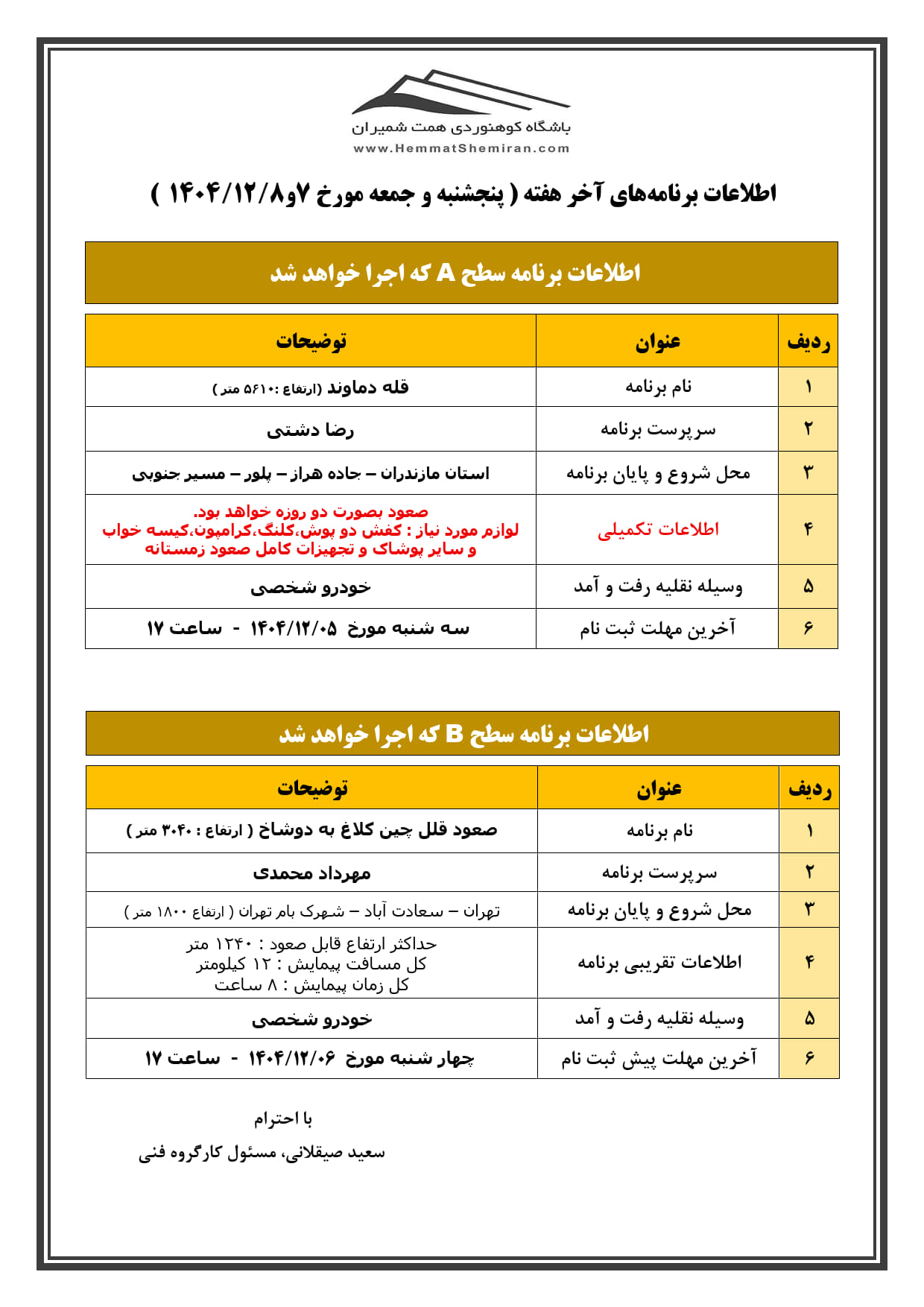 فراخوان ثبتنام برنامههای قلۀ دماوند و قلۀ دوشاخ مورخ ۸ اسفند ۱۴۰۴ از سوی کارگروه فنی باشگاه صادر گردید. علاقهمندان به شرکت در برنامه میتوانند لینک ثبت نام را تکمیل نمایند. همچنین جزییات هر یک از برنامهها در گروه پیام رسان واتساپ * و پس از اتمام مهلت ثبتنام برنامه اطلاع رسانی خواهد شد. (* لازم است شماره اعلامی در فرم ثبتنام قابل دسترس در پیام رسان واتساپ بوده و قابلیت اضافه شدن شما به گروه برای مسئولین کارگروه های باشگاه فراهم باشد.)