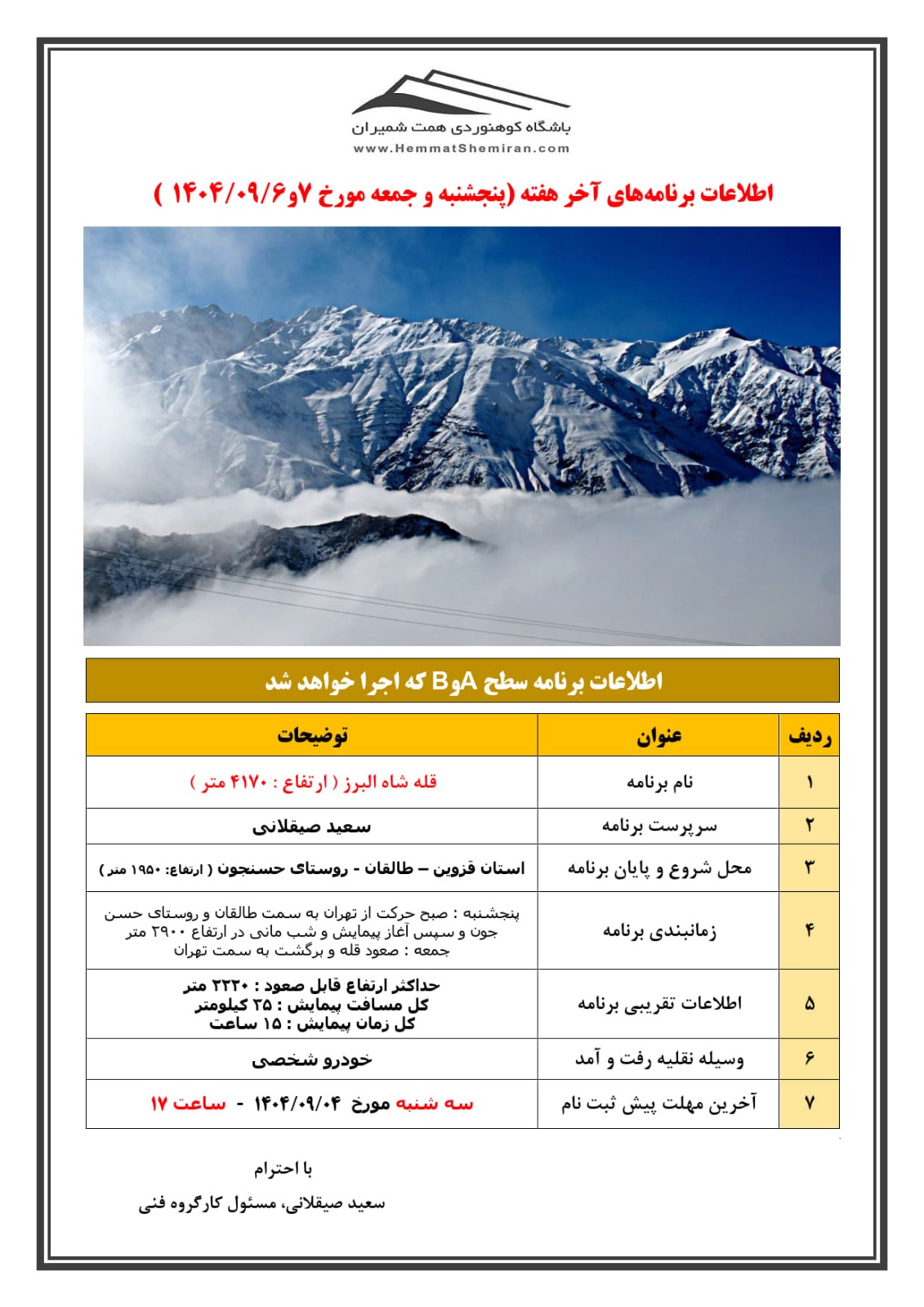 مطابق با تقویم ورزشی پاییز ۱۴۰۴ فراخوان ثبتنام برنامۀ شاهالبرز مورخ ۶و۷ آذر ۱۴۰۴ از سوی کارگروه فنی باشگاه صادر گردید. علاقهمندان به شرکت در برنامه میتوانند لینک ثبت نام را تکمیل نمایند. همچنین جزییات هر یک از برنامهها در گروه پیام رسان واتساپ * و پس از اتمام مهلت ثبتنام برنامه اطلاع رسانی خواهد شد. (* لازم است شماره اعلامی در فرم ثبتنام قابل دسترس در پیام رسان واتساپ بوده و قابلیت اضافه شدن شما به گروه برای مسئولین کارگروه های باشگاه فراهم باشد.)