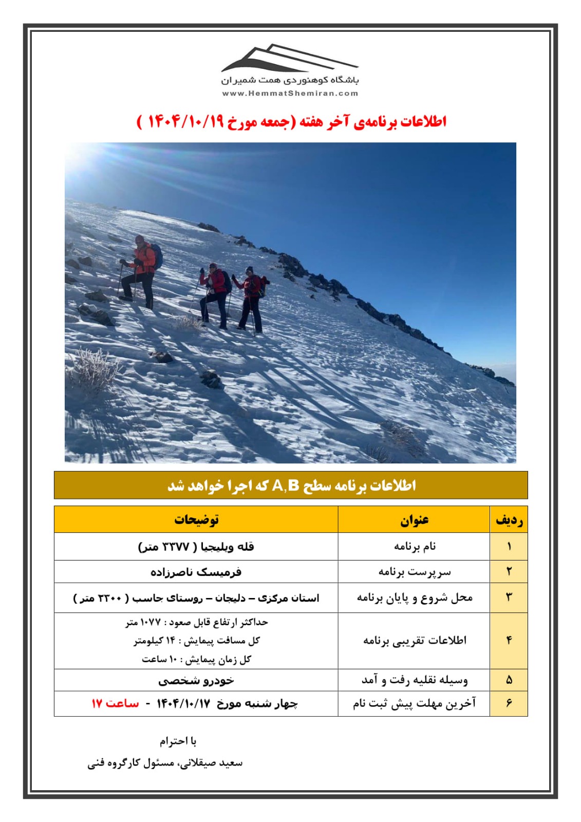 مطابق با تقویم ورزشی زمستان ۱۴۰۴ فراخوان ثبتنام برنامۀ قلۀ ویلیجیا مورخ ۱۹ دی ۱۴۰۴ از سوی کارگروه فنی باشگاه صادر گردید. علاقهمندان به شرکت در برنامه میتوانند لینک ثبت نام را تکمیل نمایند. همچنین جزییات هر یک از برنامهها در گروه پیام رسان واتساپ * و پس از اتمام مهلت ثبتنام برنامه اطلاع رسانی خواهد شد. (* لازم است شماره اعلامی در فرم ثبتنام قابل دسترس در پیام رسان واتساپ بوده و قابلیت اضافه شدن شما به گروه برای مسئولین کارگروه های باشگاه فراهم باشد.)