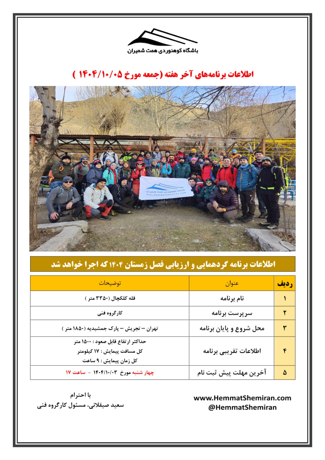 مطابق با تقویم ورزشی زمستان ۱۴۰۴ فراخوان ثبتنام برنامۀ قلۀ کلکچال (گردهمایی و ارزیابی زمستان) مورخ ۵ دی ۱۴۰۴ از سوی کارگروه فنی باشگاه صادر گردید. علاقهمندان به شرکت در برنامه میتوانند لینک ثبت نام را تکمیل نمایند. همچنین جزییات هر یک از برنامهها در گروه پیام رسان واتساپ * و پس از اتمام مهلت ثبتنام برنامه اطلاع رسانی خواهد شد. (* لازم است شماره اعلامی در فرم ثبتنام قابل دسترس در پیام رسان واتساپ بوده و قابلیت اضافه شدن شما به گروه برای مسئولین کارگروه های باشگاه فراهم باشد.)